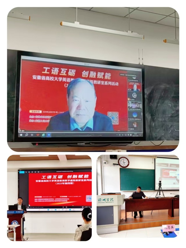 为深入推进“四新”建设背景下的大学英语教学改革,探索英语教育与专业人才培养深度融合新路径,由安徽省外国语言文学学会大学英语教学研究分会主办,安徽工业大学外国语学院、滁州学院外国语学院共同承办的安徽省高校大学英语教育教学虚拟教研室2025年第四期活动于10月27日14:30通过腾讯会议成功举行。本期活动主题为“工语互砺,创融赋能”,旨在通过跨校研讨,共享智慧、共谋发展。安徽省外国语言文学学会秘书长曹军、大学英语教学研究分会秘书长郭书法教授及安徽省各高校大学英语教师约200人通过线上、线下参会。