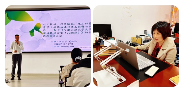 上半场活动由安徽工业大学外国语学院院长戴拥军教授主持。 曹军在开场致辞时指出,在新文科建设中,大学英语教师应从语言传授者转变为跨学科主导者,并注重学生能力培养。安徽工业大学外国语学院大学英语教学部主任夏侯勤副教授首先带来题为《以工促语、以语赋能:理工科背景下大学英语课程体系创新与实践》的主旨分享。他基于本校制定的《安徽工业大学大学英语修读方案(2025版)》,结合学校办学定位、服务地方发展要求及理工科学生大学英语学习现状,介绍了“三层模块+双规路径”课程体系、积极推进线上线下融合教学与跨学科协作等内容,并强调将课程思政与育人目标相融合、通过英语课堂讲好中国故事。该院大学英语教学部副主任方芳副教授聚焦于特色鲜明的冶金工程领域,通过“六阶融合”教学模式结构图,做了题为《安徽工业大学冶金通用学术英语教学改革探索》的专题报告,介绍如何将大学英语教学与学生专业需求紧密结合,并展示了在“工科+英语”教学改革方面的具体举措与阶段性成果。
